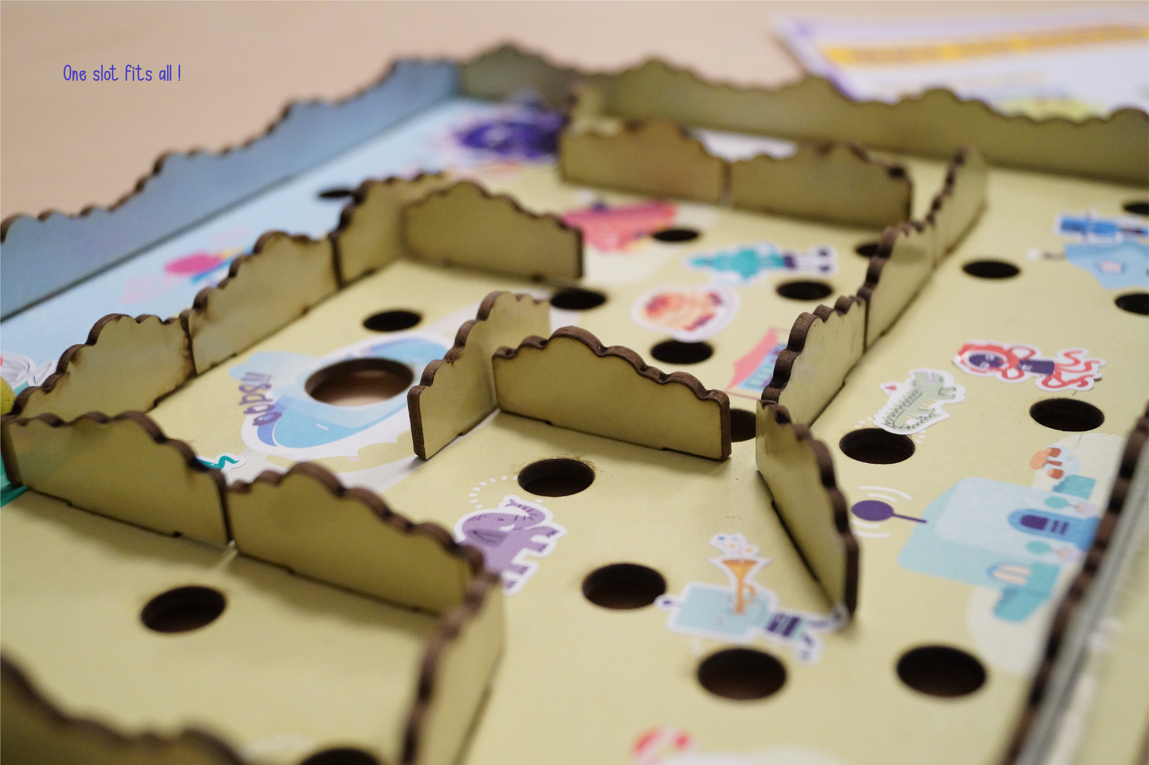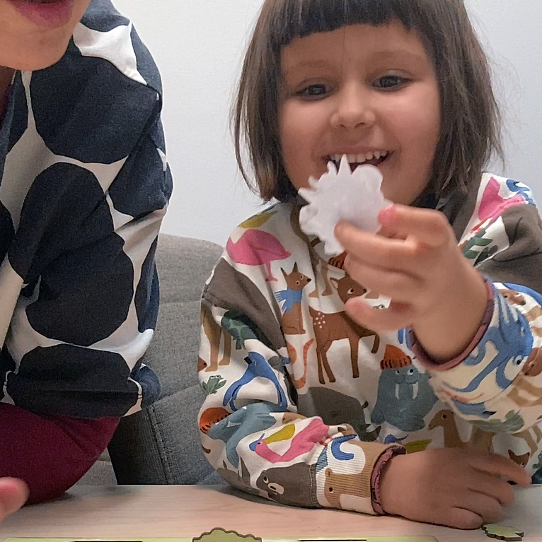 The stickers serve as a prompt for storytelling. The stickers help tell the story about Multi and his search for a home. The child can choose from a variety of stickers and decorate the board. When finished, he can roll the Multi marble through the maze and see where it lands. Which sticker it lands on is the object you can incorporate into the story!