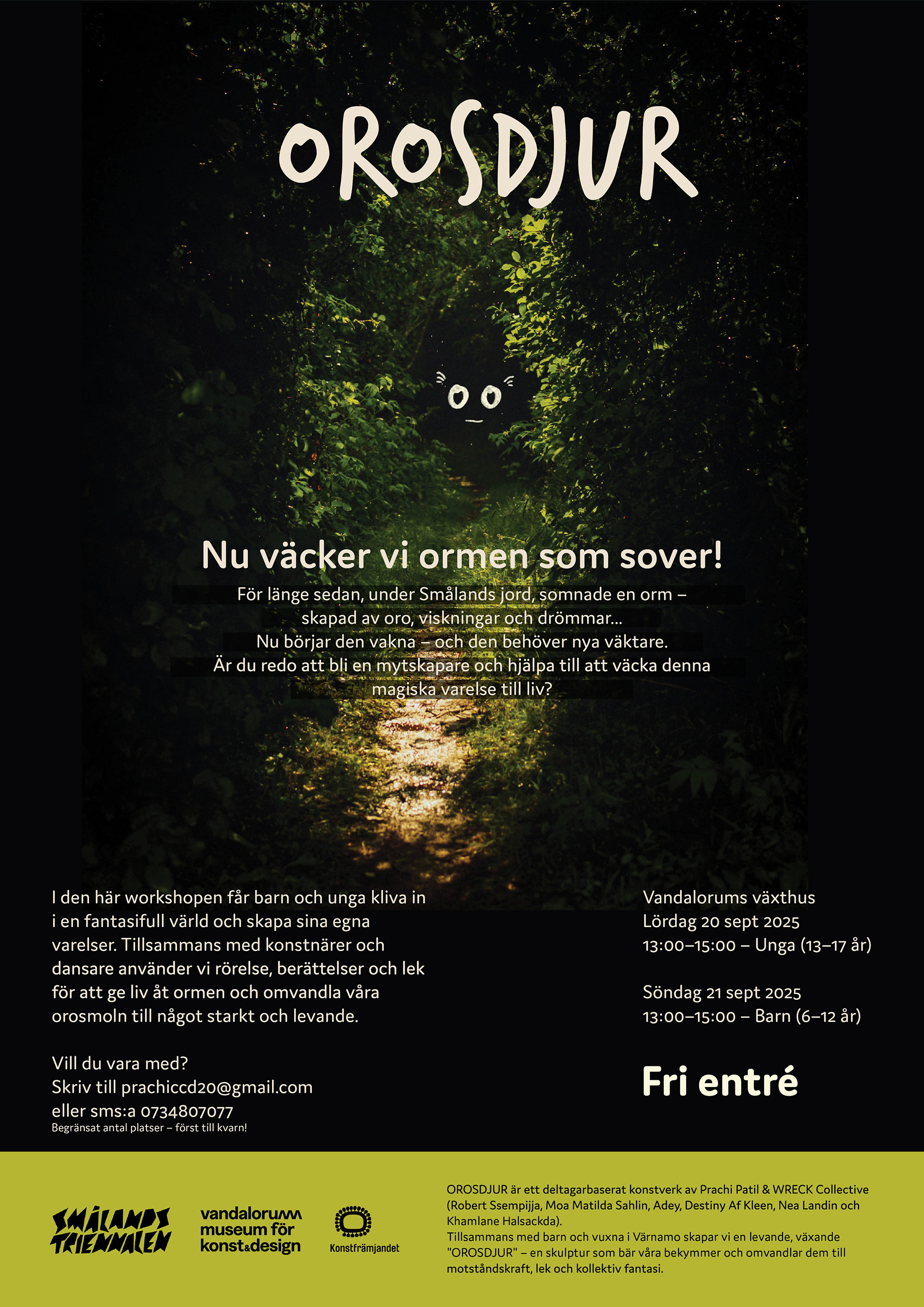 OROSDJUR is an exploratory and participatory art project that creates a living, growing sculpture in collaboration with children and the local community in Småland. Rooted in the theme “ORO – Konst, beredskap och motstånd”, the project investigates how anxiety can become artistic material—transformed through collective action, sound, movement, and growth.
